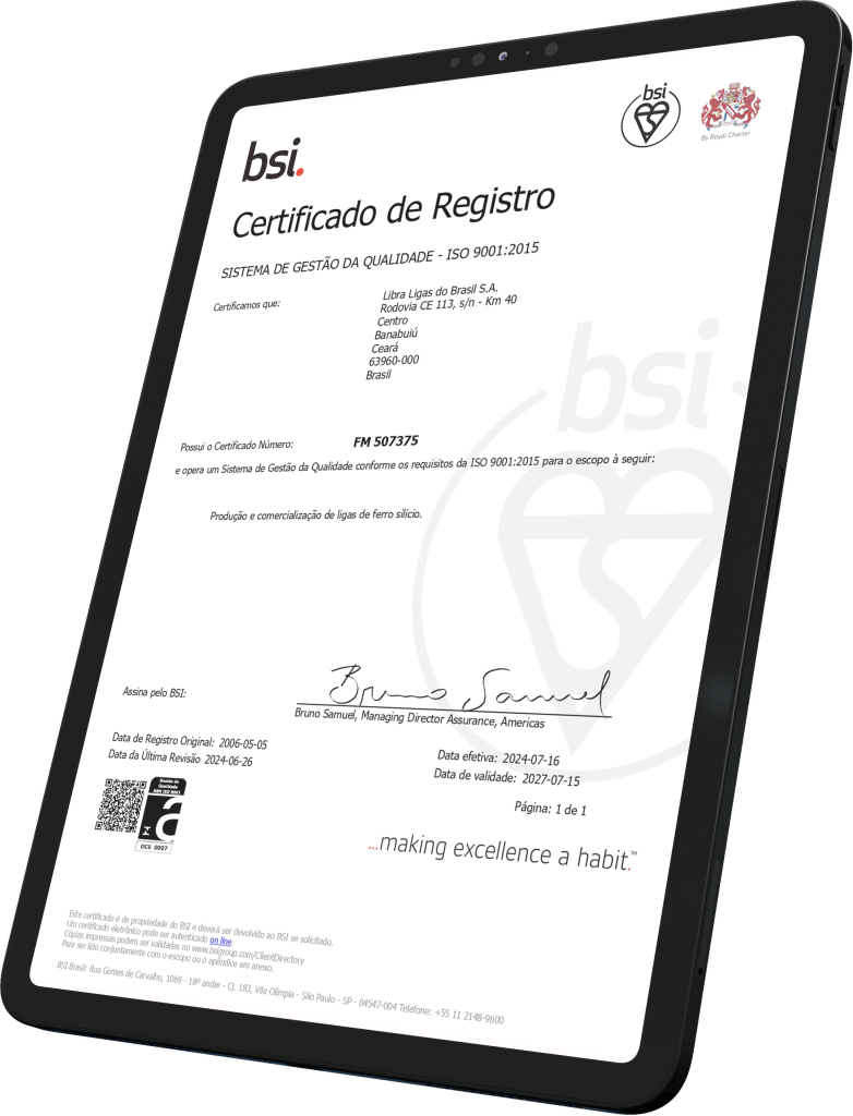 A empresa também conta com a certificação ISO 9001:2015, concedida pela BSI (British Standards Institution), que atesta a conformidade do seu Sistema de Gestão da Qualidade. Essa certificação é um reconhecimento do comprometimento da Libra com a melhoria contínua, a eficiência dos processos e a gestão responsável de seus recursos.
